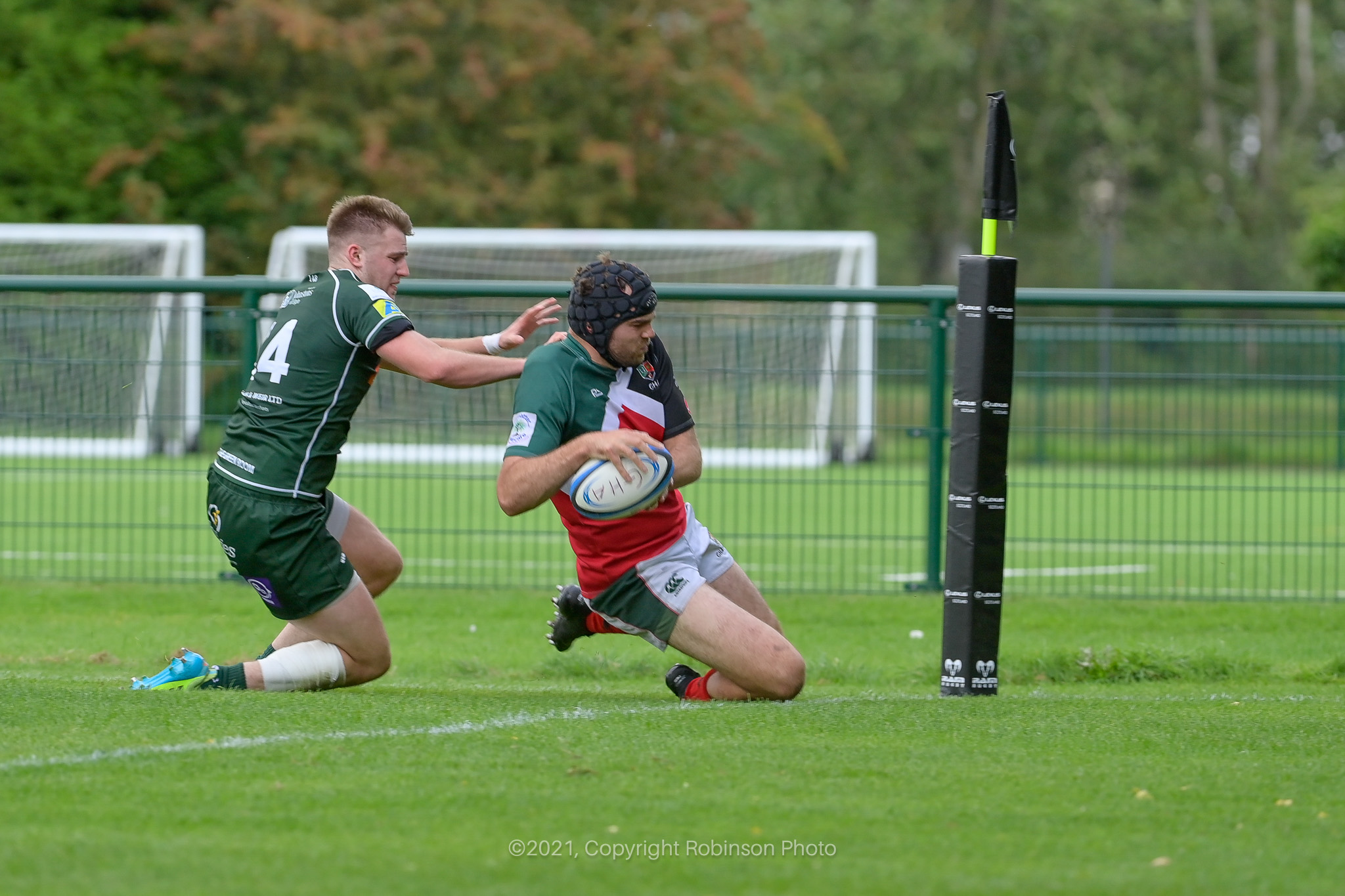 GHA Captain Jamie McCarthy runs in to score in the corner during the GHA RFC v Hawick RFC Tennents Premiership 2021-2022 match at GHA RFC Braidholm, Glasgow on Saturday, 11 September 2021