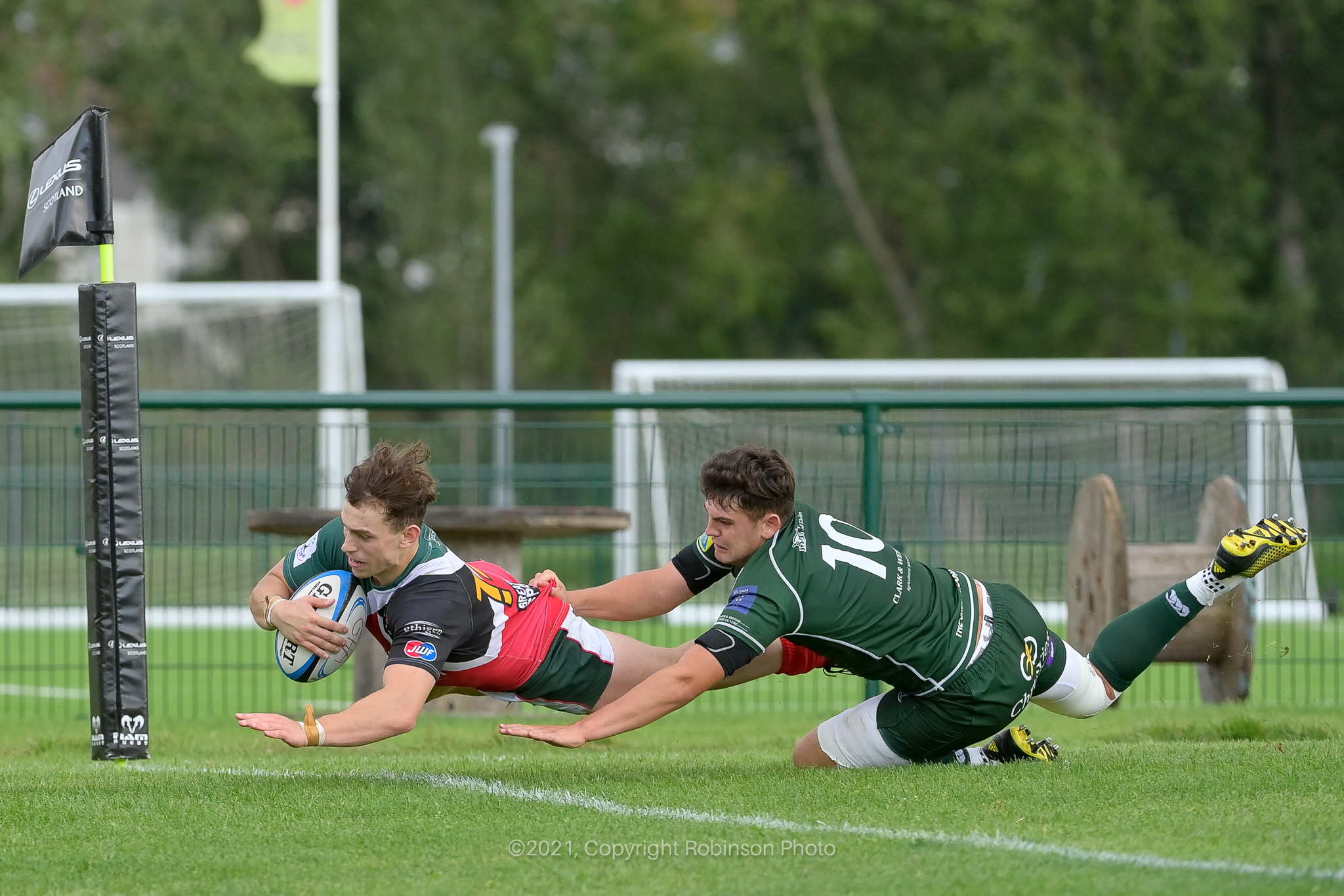 Adam Scott, Bailey DonaldsonAdam Scott GHA’s Adam Scott beats Hawick’s Bailey Donaldson to score in the corner during the GHA RFC v Hawick RFC Tennents Premiership 2021-2022 match at Braidholm, Glasgow on Saturday, 11 September 2021