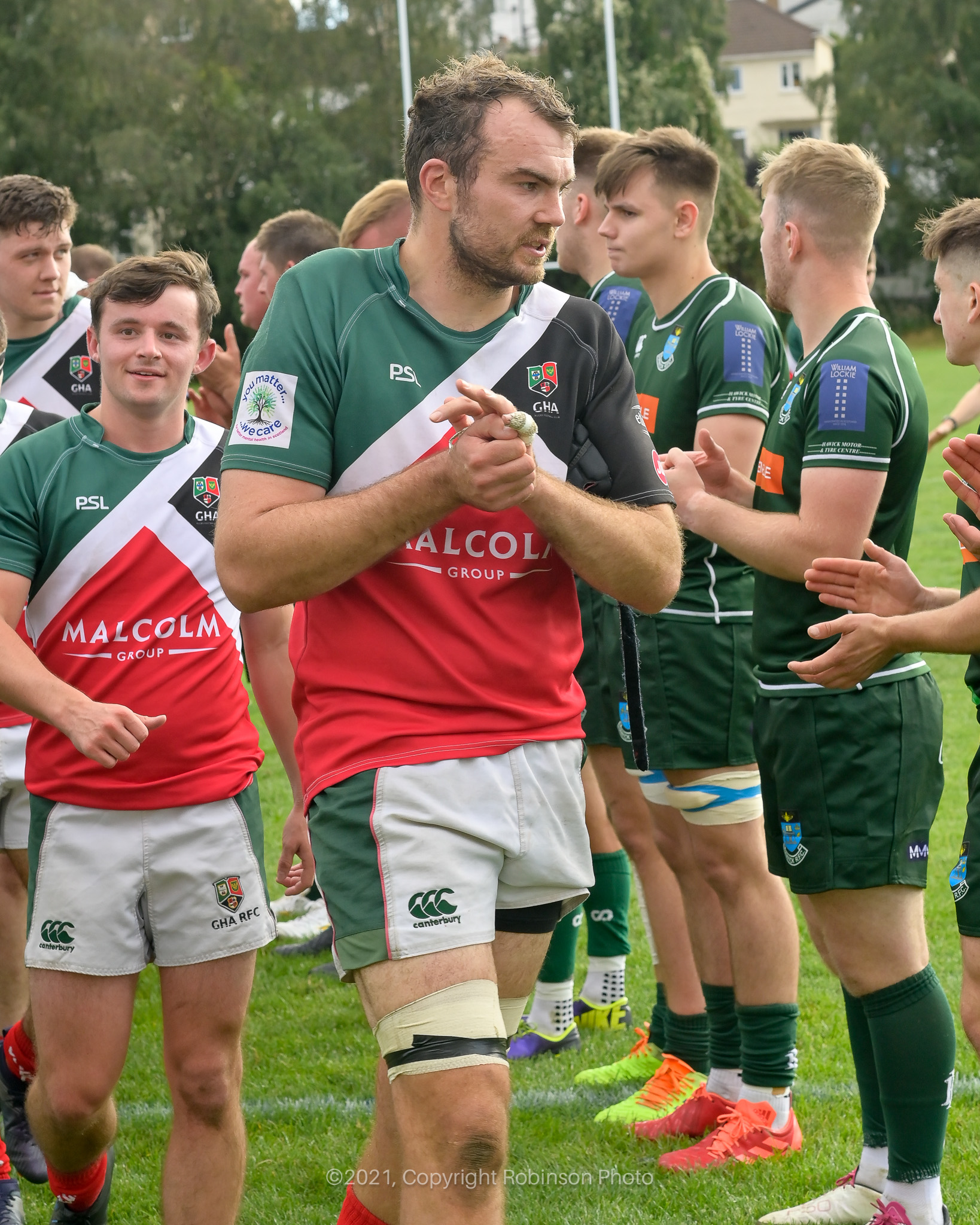 Jamie McCarthy, GHA Captain leads his team from the pitch after the GHA RFC v Hawick RFC Tennents Premiership 2021-2022 match at GHA RFC Braidholm, Glasgow on Saturday, 11 September 2021