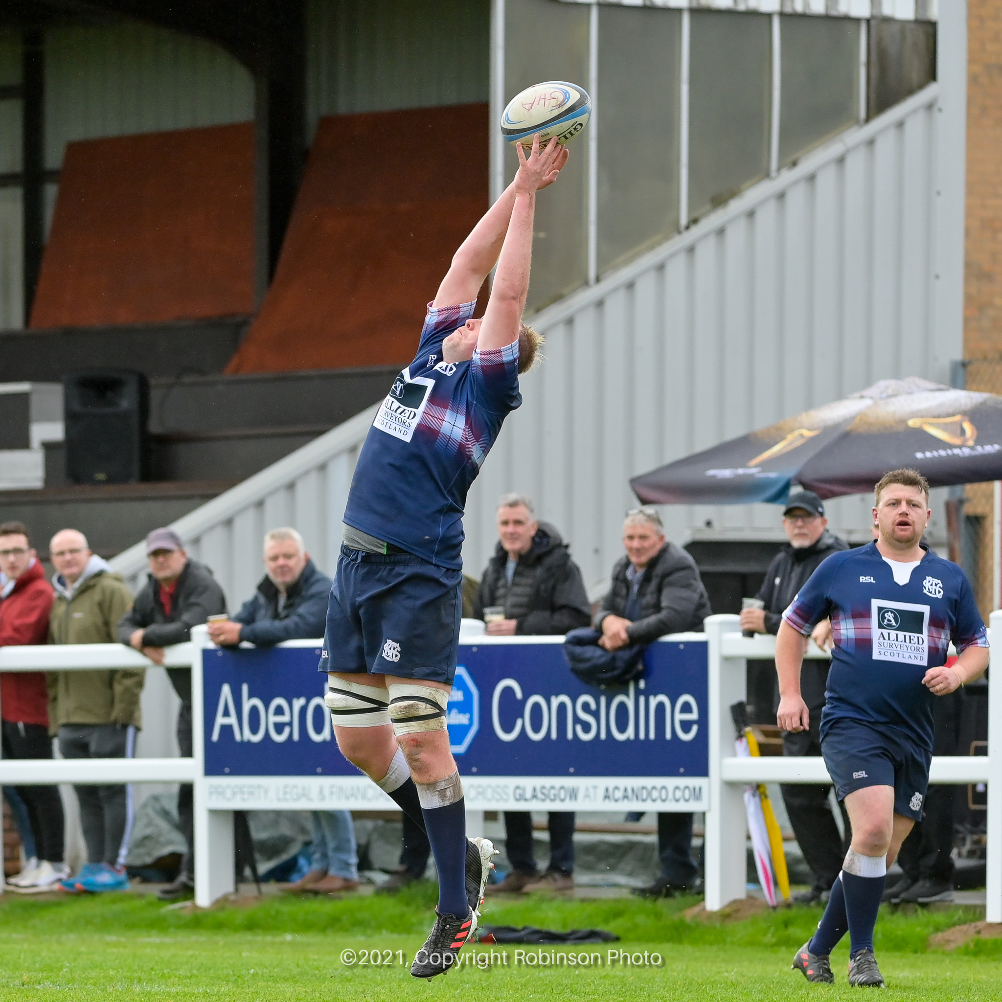 A Selkirk player just fails to gather the ball during the match between GHA RFC and Selkirk RFC in the SRU Tennents Premiership 2021-2022 at Braidholm, Glasgow on Saturday, 2 October, 2021