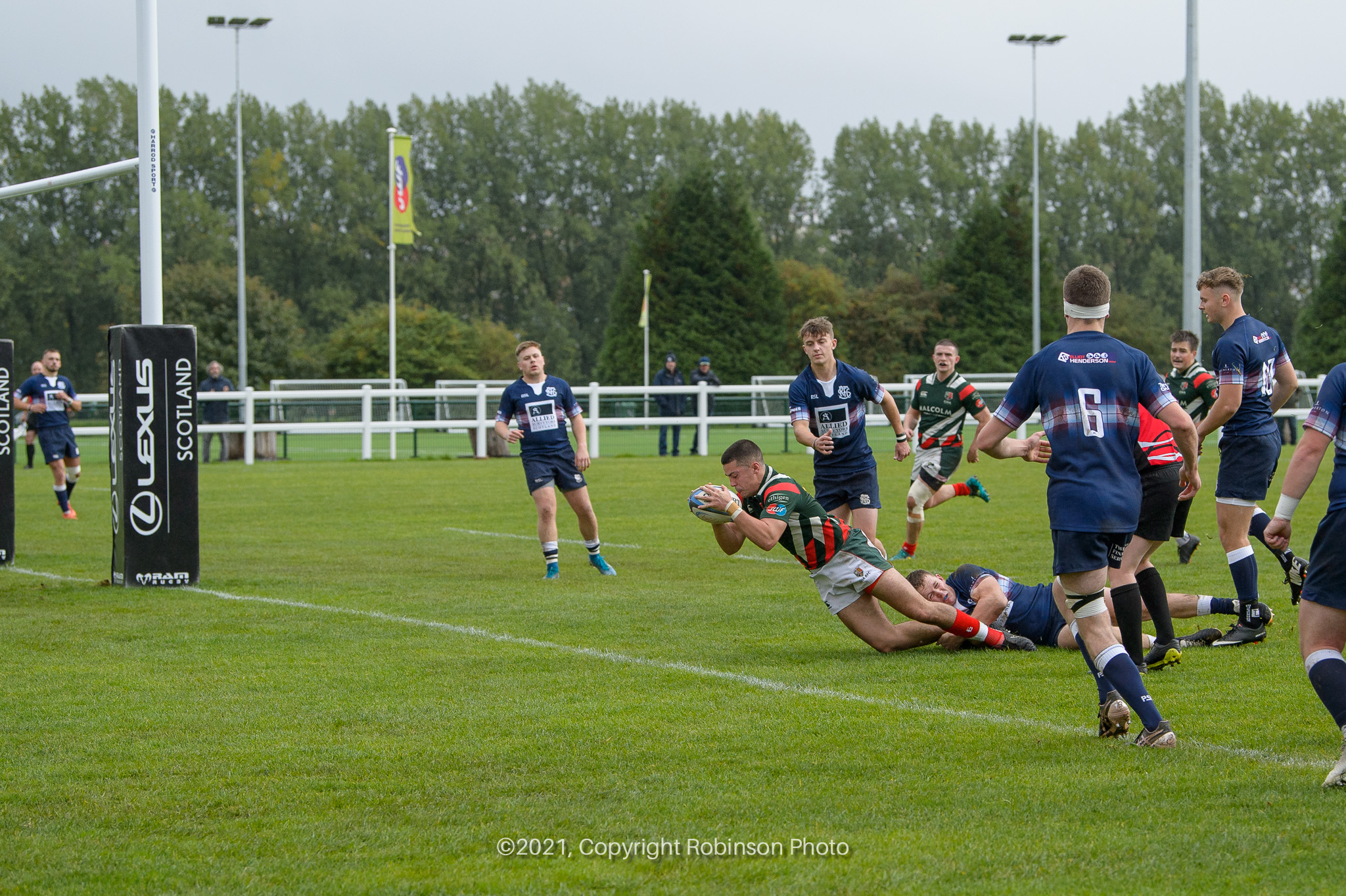 Max MacFarlane dives over the line to score a try, during the match between GHA RFC and Selkirk RFC in the SRU Tennents Premiership 2021-2022 at Braidholm, Glasgow on Saturday, 2 October, 2021