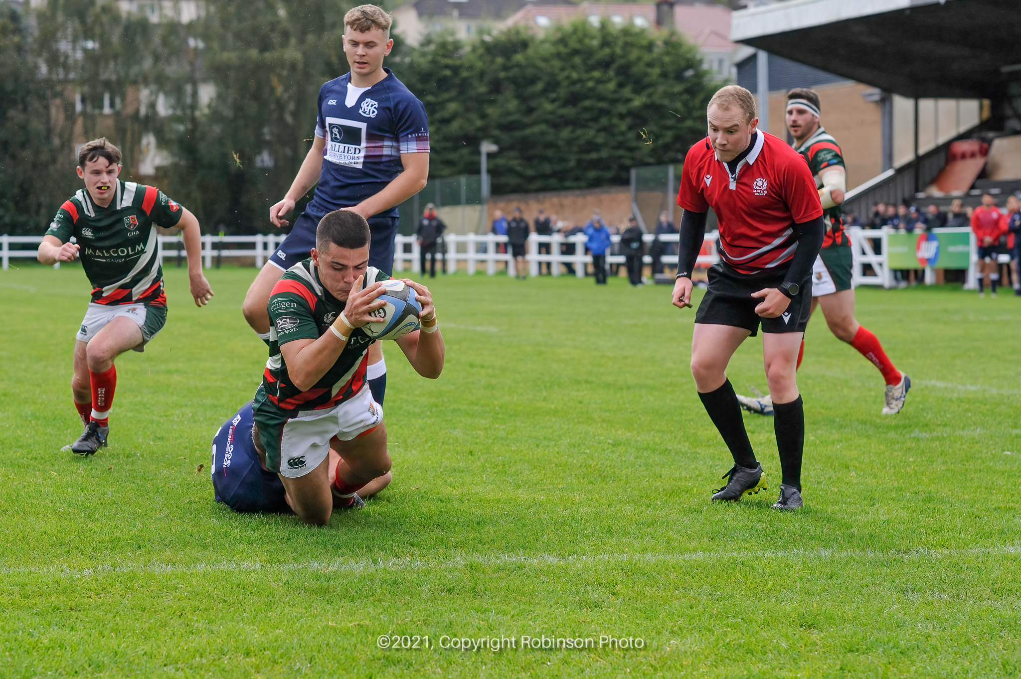 Max MacFarlane dives over the line to score during the match between GHA RFC and Selkirk RFC in the SRU Tennents Premiership 2021-2022 at Braidholm, Glasgow on Saturday, 2 October, 2021