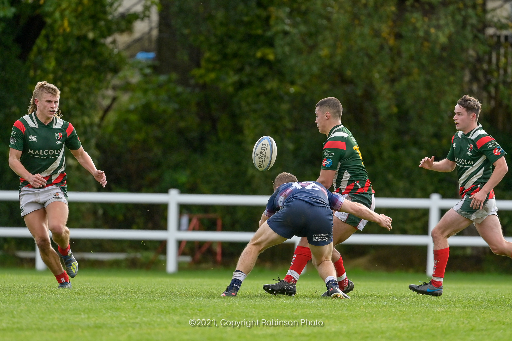 Grant Mollinson, Max MacFarlane, George Baird during the match between GHA RFC and Selkirk RFC in the SRU Tennents Premiership 2021-2022 at Braidholm, Glasgow on Saturday, 2 October, 2021